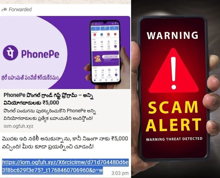 संक्रांति के दौरान WhatsApp ग्रुप्स में एक लिंक वायरल हो रहा है। 'PhonePe पोंगल ग्रैंड गिफ्ट प्रोग्राम - सभी यूज़र्स के लिए Rs. 5000' कहते हुए एक ल...